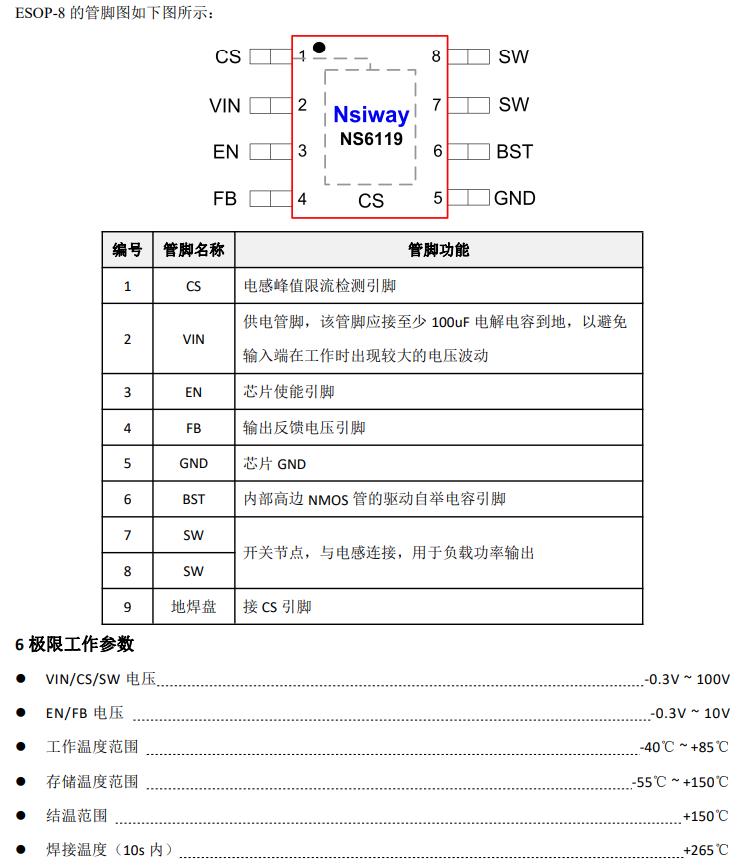 NS6119 采用 ESOP8 的標(biāo)準(zhǔn)封裝。