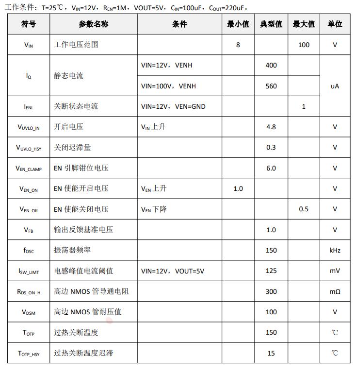 特性 ? 寬輸入電壓范圍:8V-100V ? 最大 1.5A 輸出電流 ? 電感最大峰值電流可調(diào)節(jié) ? 低待機(jī)功耗 ? 外置 FB 引腳,輸出電壓可調(diào)節(jié) ? 支持 EN 使能控制 ? 異步降壓開關(guān)頻率 150KHz ? 內(nèi)置軟啟動(dòng) ? 內(nèi)置過溫保護(hù)、輸出短路保護(hù) ? 封裝形式 ESOP8