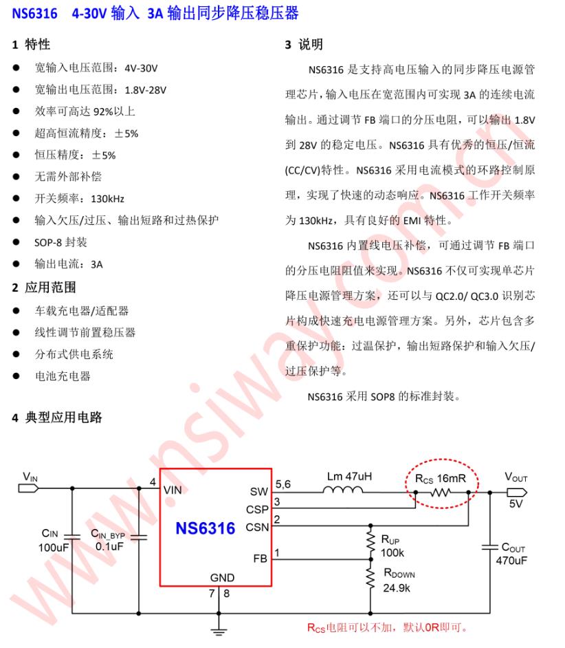 理,實現(xiàn)了快速的動態(tài)響應(yīng)。NS6316工作開關(guān)頻率為130kHz,具有良好的EMI特性。
