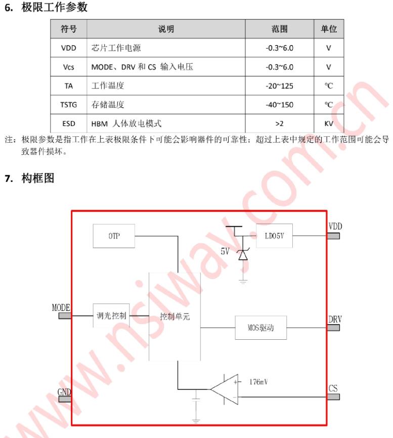 NS1705SC是一款外圍電路簡單的Buck型平均電流檢測模式的LED恒流驅(qū)動器,適用于8-100V電壓范圍的非隔離式大功率恒流LED驅(qū)動領(lǐng)域。芯片采用固定頻率140kHz的PWM工作模式,利用平均電流檢測模式,因此具有優(yōu)異的負(fù)載調(diào)整率特性,高精度的輸出電流特性。芯片集成了高低亮功能,可以通過MODE端口實現(xiàn)高低亮功能切換。在MODE引腳懸空或接地時,為高亮模式,MODE引腳接高電平時,為1/2電流的低亮模式。此外芯片內(nèi)部集成了VDD鉗位穩(wěn)壓管以及過溫保護(hù)電流等,減小了外圍電路元件數(shù)量并提高了系統(tǒng)的可靠性。NS1705SC采用了SOT23-6封裝。
