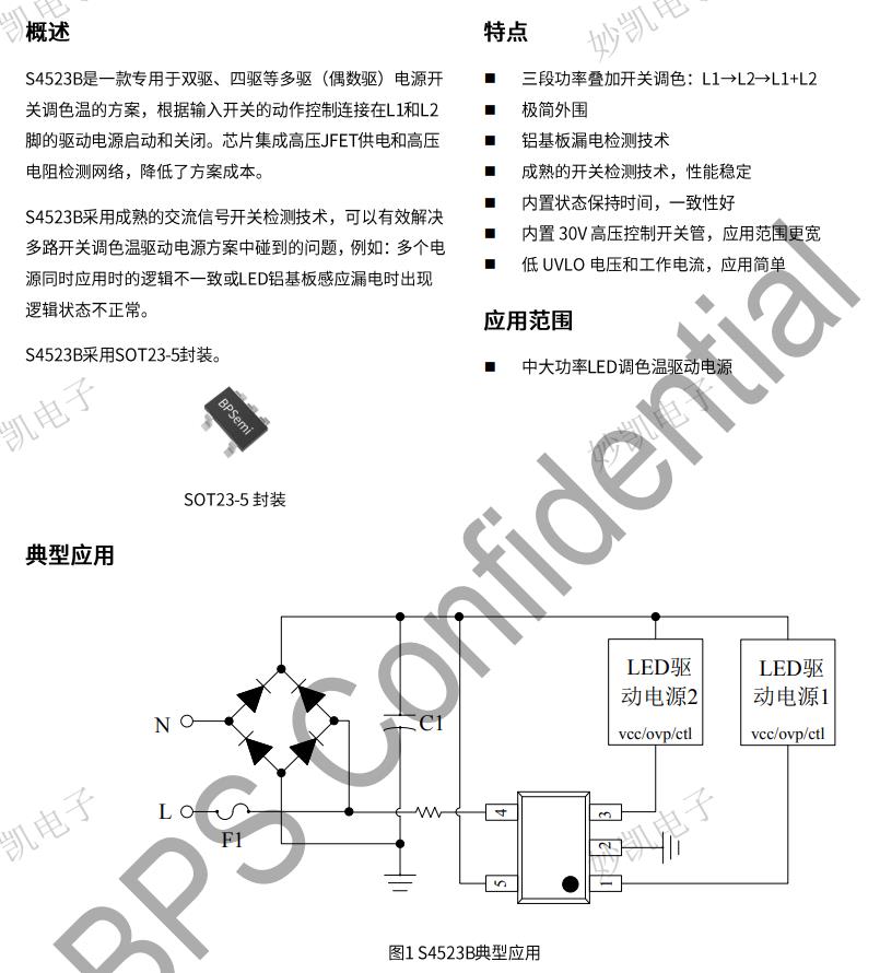 S4523B/RB是一款專用于雙驅(qū)、四等多驅(qū)(偶數(shù)驅(qū)) 電源開關(guān)調(diào)色溫的方案,根據(jù)輸入開關(guān)的動(dòng)作控制連接在L1和L2腳的驅(qū)動(dòng)電源啟動(dòng)和關(guān)閉。芯片集成高壓JFET供電和高壓電阻檢測網(wǎng)絡(luò),降低了方案成本。S4523B/RB采用成熟的交流信號(hào)開關(guān)檢測技術(shù),可以有效解決多路開關(guān)調(diào)色溫驅(qū)動(dòng)電源方案中碰到的問題,例如:多個(gè)電源同時(shí)應(yīng)用時(shí)的邏輯不一致或LED鋁基板感應(yīng)漏電時(shí)出現(xiàn)邏輯狀態(tài)不正常。