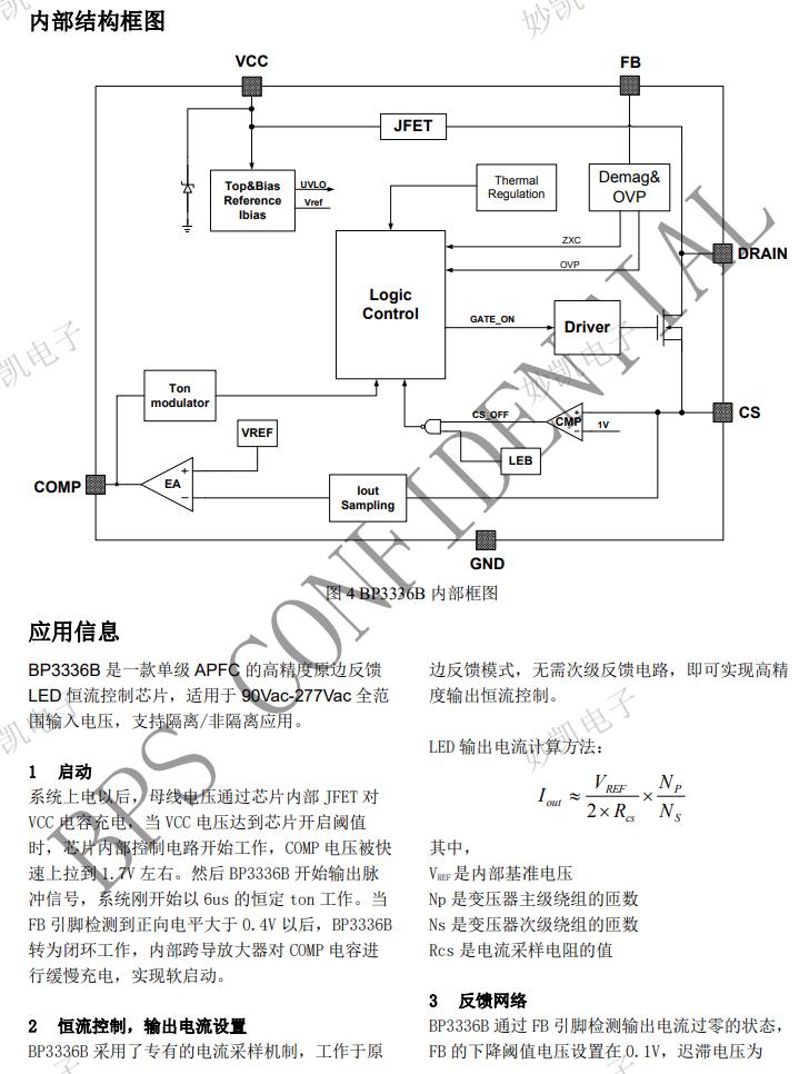 BP3336B 芯片采用固定導(dǎo)通時(shí)間的控制機(jī)制,能夠 實(shí)現(xiàn)高功率因數(shù)。內(nèi)置 THD 優(yōu)化模塊可以進(jìn)一步 降低了 THD,針對(duì)全電壓輸入,可以實(shí)現(xiàn) THD<15%。 開關(guān)工作在臨界導(dǎo)通模式,降低開關(guān)損耗及 EMI。 BP3336B 內(nèi)置高壓啟動(dòng),搭配快速啟動(dòng)控制,可以 在全電壓輸入下實(shí)現(xiàn)小于 500ms 以內(nèi)的啟動(dòng)時(shí)間。 BP3336B 內(nèi)置輸入電壓和負(fù)載補(bǔ)償線路,可以實(shí)現(xiàn) 極佳的線性調(diào)整率和負(fù)載調(diào)整率。