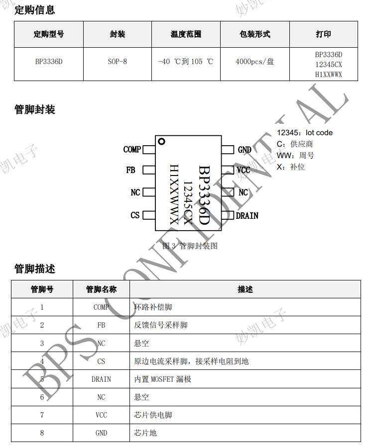 BP3336D 內(nèi)置輸入電壓和負(fù)載補(bǔ)償線路,可以實(shí)現(xiàn) 極佳的線性調(diào)整率和負(fù)載調(diào)整率。 BP3336D 可以支持單繞組浮地 Buck-boost 或者兩 繞組/三繞組的隔離 Flyback 拓?fù)洹?nbsp; BP3336D 采用 SOP-8 封裝。