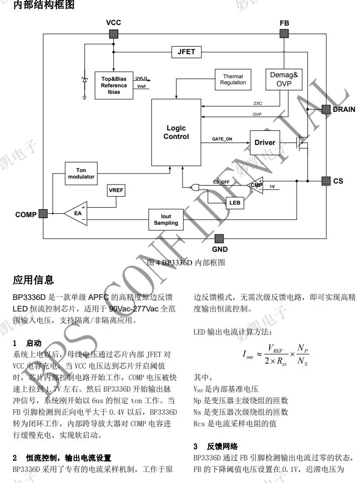 BP3336D 是一款單級(jí) APFC 的高精度原邊反饋 LED 恒流驅(qū)動(dòng)器,內(nèi)置 650V 高壓 MOSFET,適用于 90Vac-277Vac 全范圍輸入電壓。 BP3336D 芯片采用固定導(dǎo)通時(shí)間的控制機(jī)制,能夠 實(shí)現(xiàn)高功率因數(shù)。內(nèi)置 THD 優(yōu)化模塊可以進(jìn)一步 降低了 THD,針對(duì)全電壓輸入,可以實(shí)現(xiàn) THD<15%。 開關(guān)工作在臨界導(dǎo)通模式,降低開關(guān)損耗及 EMI。 BP3336D 內(nèi)置高壓啟動(dòng),搭配快速啟動(dòng)控制,可以 在全電壓輸入下實(shí)現(xiàn)小于 500ms 以內(nèi)的啟動(dòng)時(shí)間。