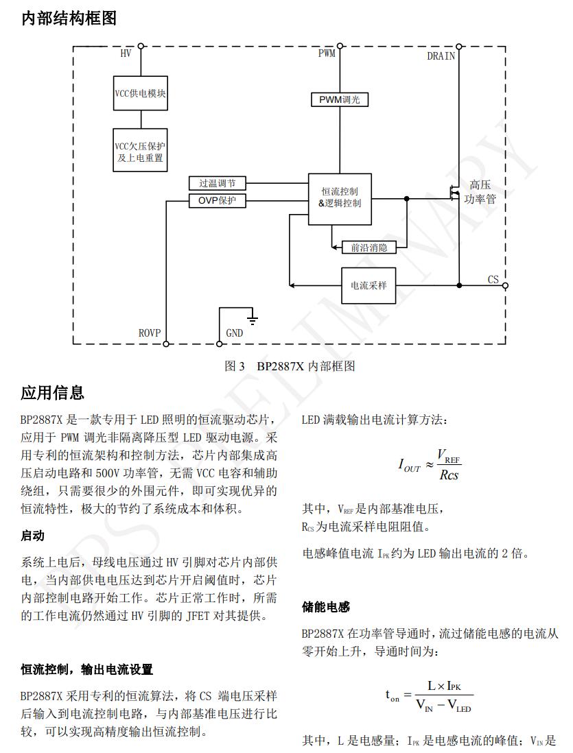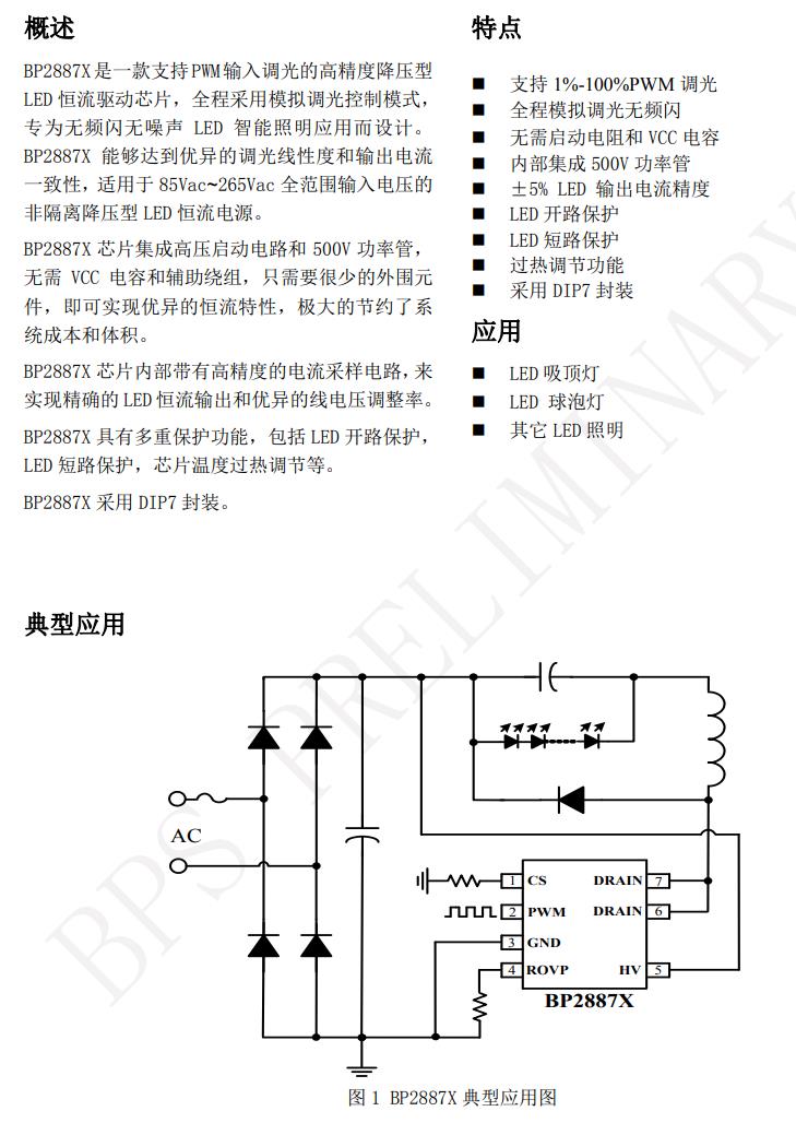 BP2887X 芯片內(nèi)部帶有高精度的電流采樣電路,來 實現(xiàn)精確的 LED 恒流輸出和優(yōu)異的線電壓調(diào)整率。 BP2887X 具有多重保護功能,包括 LED 開路保護, LED 短路保護,芯片溫度過熱調(diào)節(jié)等。