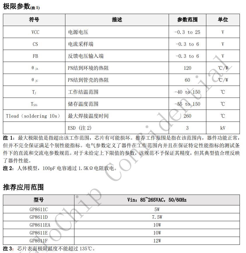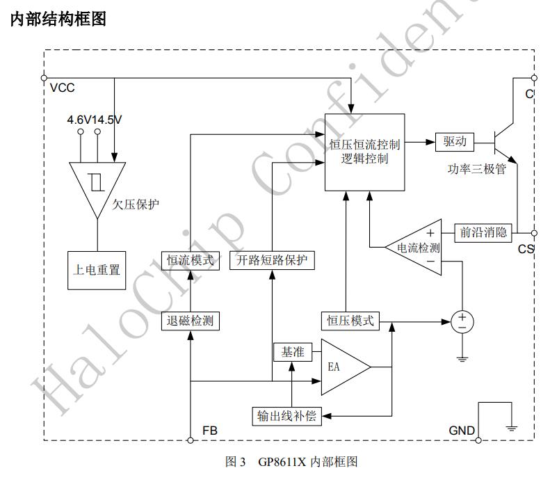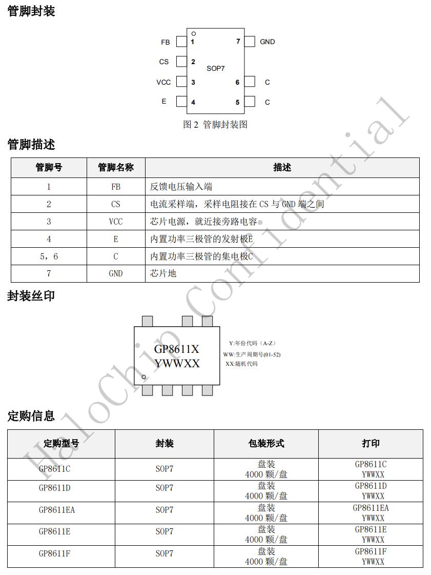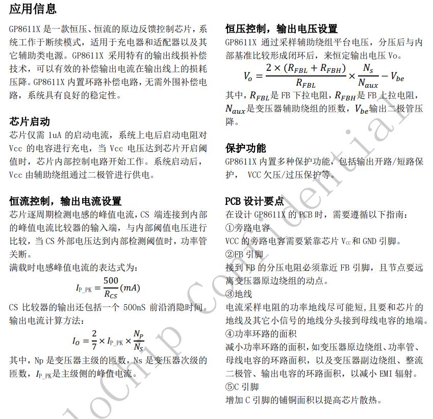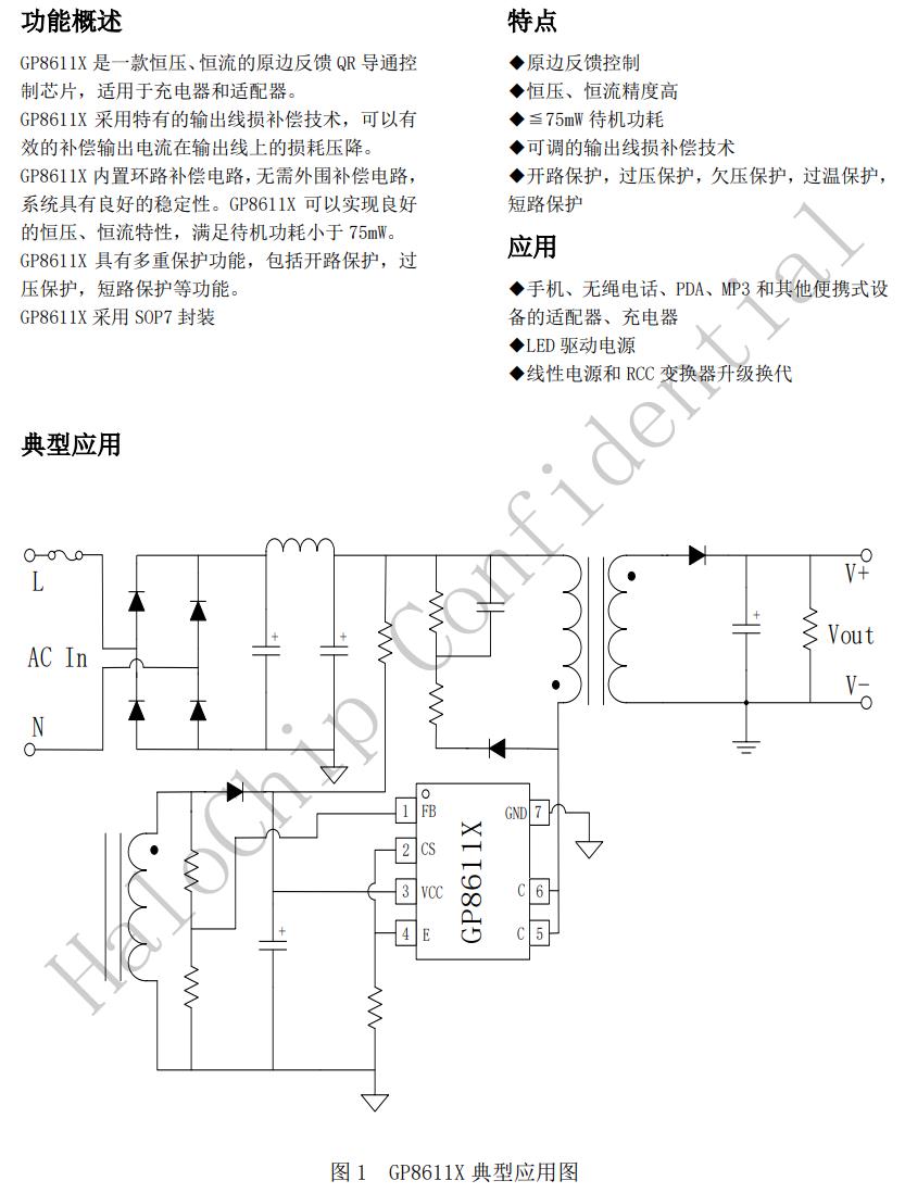 GP8611X內(nèi)置環(huán)路補(bǔ)償電路,無需外圍補(bǔ)償電路,系統(tǒng)具有良好的穩(wěn)定性。GP8611X可以實(shí)現(xiàn)良好的恒壓、恒流特性,滿足待機(jī)功耗小于75mW。GP8611X具有多重保護(hù)功能,包括開路保護(hù),過壓保護(hù),短路保護(hù)等功能。GP8611X采用SOP7封裝