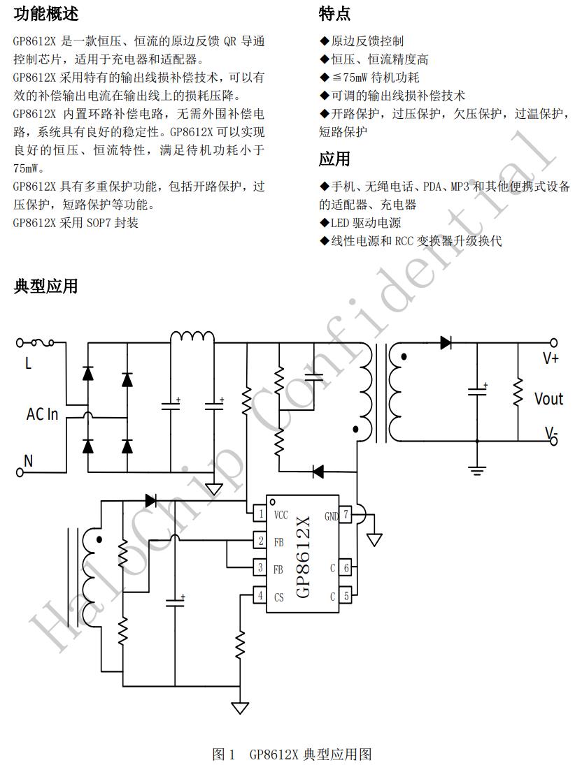 原邊反饋控制恒壓、恒流精度高≦75mW待機(jī)功耗可調(diào)的輸出線損補(bǔ)償技術(shù)開(kāi)路保護(hù),過(guò)壓保護(hù),欠壓保護(hù),過(guò)溫保護(hù),短路保護(hù)