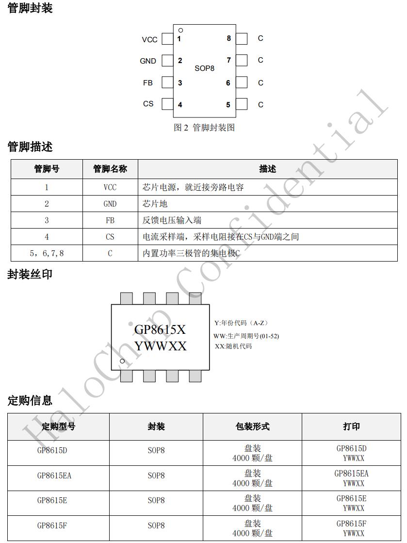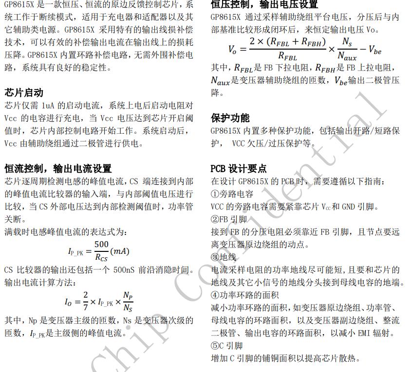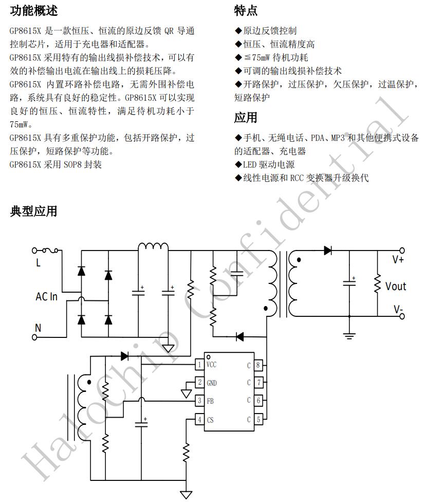 GP8615X是一款恒壓、恒流的原邊反饋QR導通控制芯片,適用于充電器和適配器。GP8615X采用特有的輸出線損補償技術(shù),可以有效的補償輸出電流在輸出線上的損耗壓降。