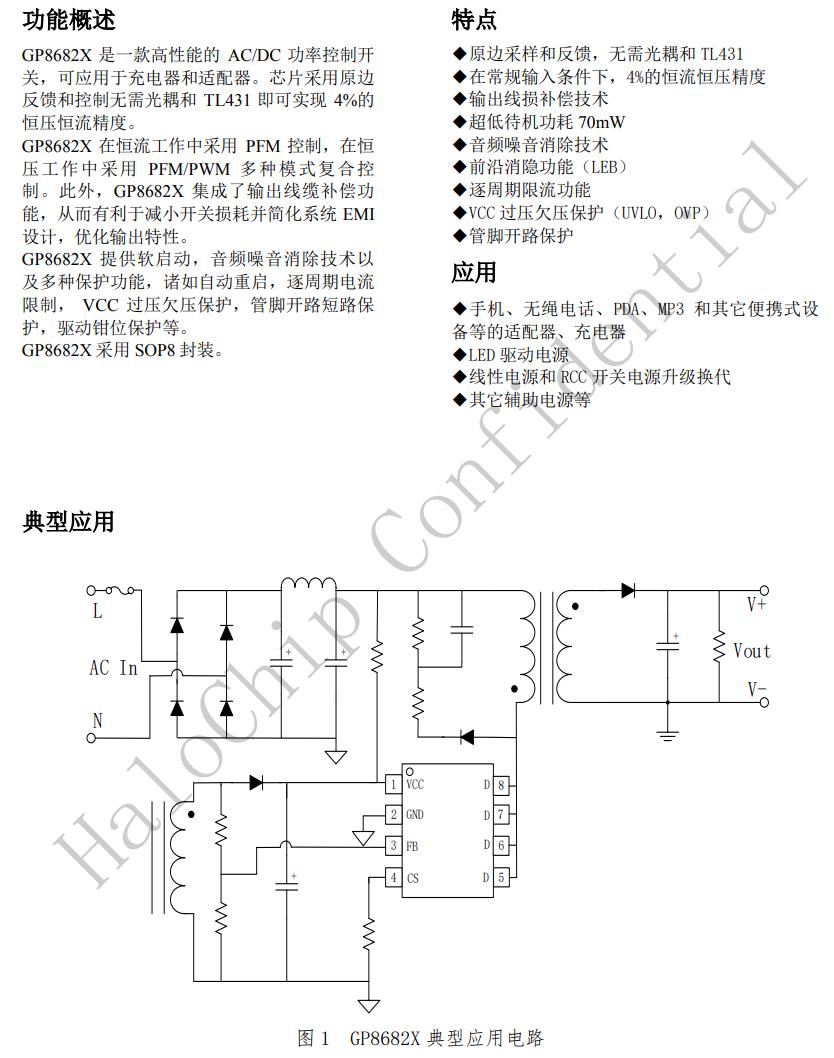 GP8682X是一款高性能的AC/DC功率控制開關(guān),可應(yīng)用于充電器和適配器。芯片采用原邊反饋和控制無需光耦和TL431即可實(shí)現(xiàn)4%的恒壓恒流精度。