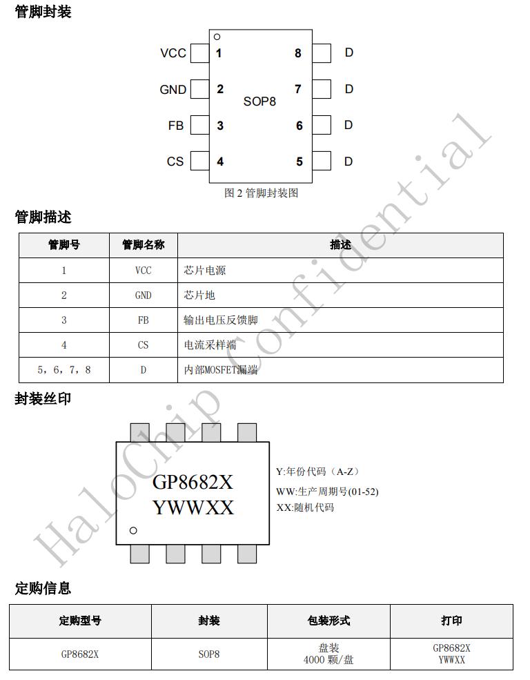 GP8682X提供軟啟動(dòng),音頻噪音消除技術(shù)以及多種保護(hù)功能,諸如自動(dòng)重啟,逐周期電流限制,VCC過壓欠壓保護(hù),管腳開路短路保護(hù),驅(qū)動(dòng)鉗位保護(hù)等。GP8682X采用SOP8封裝。