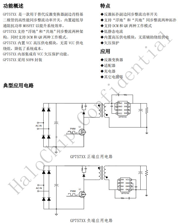 GP757XX是一款用于替代反激變換器副邊肖特基二極管的高性能同步整流功率開(kāi)關(guān),內(nèi)置超低導(dǎo)通阻抗功率MOSFET以提升系統(tǒng)效率。