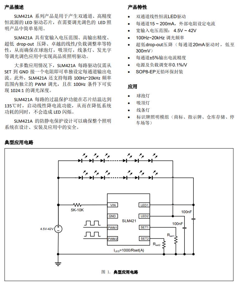 SLM421A 系列產(chǎn)品是用于產(chǎn)生雙通道、高精度恒流源的 LED 驅(qū)動芯片,在需要調(diào)光調(diào)色的 LED 照明產(chǎn)品中簡單易用。