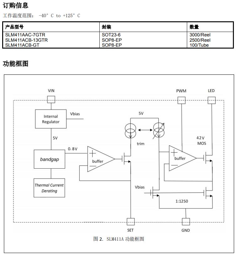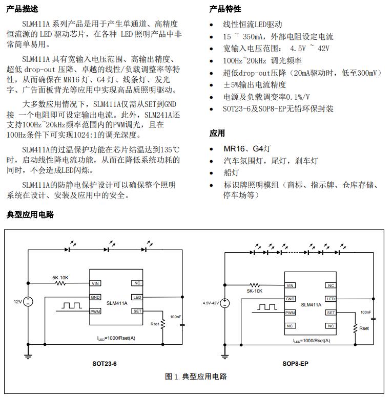 SLM411A 系列產(chǎn)品是用于產(chǎn)生單通道、高精度恒流源的 LED 驅(qū)動(dòng)芯片,在各種 LED 照明產(chǎn)品中非常簡(jiǎn)單易用。SLM411A 具有寬輸入電壓范圍、高輸出精度、超低 drop-out 壓降、卓越的線性/負(fù)載調(diào)整率等特性,從而確保在 MR16 燈、G4 燈、線條燈、發(fā)光字、廣告面板背光等應(yīng)用中實(shí)現(xiàn)高品質(zhì)照明驅(qū)動(dòng)。大多數(shù)應(yīng)用情況下,SLM411A僅需從SET到GND接 一個(gè)電阻即可設(shè)定輸出電流。此外,SLM241A還支持100Hz~20kHz頻率范圍內(nèi)的PWM調(diào)光,且在100Hz條件下可實(shí)現(xiàn)1024:1的調(diào)光深度。SLM411A的過溫保護(hù)功能在芯片結(jié)溫達(dá)到135℃時(shí),啟動(dòng)線性降電流功能,從而在降低系統(tǒng)功耗的同時(shí),不會(huì)造成LED閃爍。SLM411A的防靜電保護(hù)設(shè)計(jì)可以確保整個(gè)照明系統(tǒng)在設(shè)計(jì)、安裝及應(yīng)用中的安全。